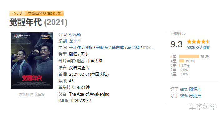 就像此前的《觉醒年代》,按说够主旋律了吧,结果在以年轻人为主的豆瓣上,不仅获得了9.3分的超高评分,评分人数更是超过了53万。